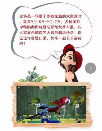 您想和紅金剛、藍金剛、大緋胸、葵花鸚鵡、大白鸚鵡、芙蓉鸚鵡.....等數十只不同鸚鵡零距離鑒賞及互動拍照嗎?就在9月15日-9月17日,邵陽秋季車展,我們不見不散!